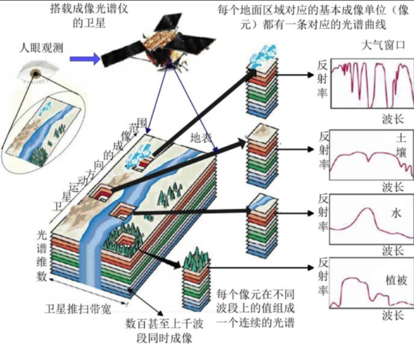 王院长是搞卫星遥感的,所以主要内容也就是卫星拍下的各类图像数据的处理,让我感觉很厉害的是卫星使用多光谱技术后所能做的事情。以下是卫星多光谱成像原理图: