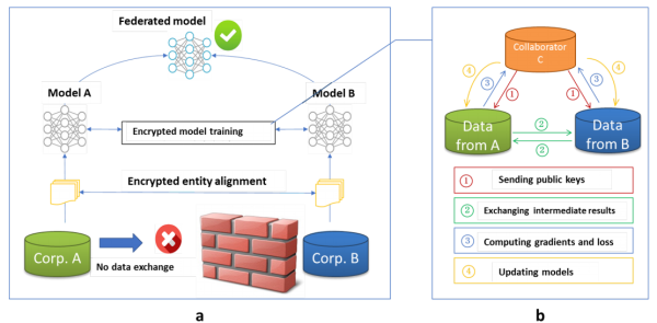 这种方法一开始是 Google 为了训练手机输入法 Gboard[1] 才提出的,现在用于金融行业非常有效,金融公司之间有不少客户不同,金融与互联网公司合作,同一客户数据段不同,使用联邦学习技术,可以互补数据而合作方又并不会真的拿到模型或数据,模型在数据源间流转,而不再是数据在各自模型间流通。